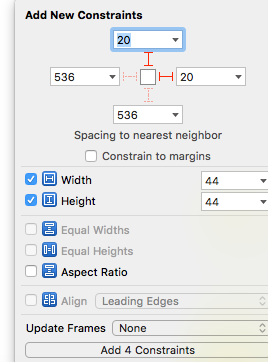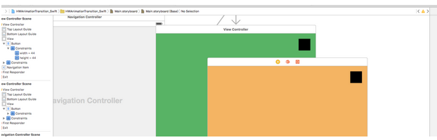 然后在两个VC上分别在同样的位置添加两个完全相同的按钮,位置约束在右上角距离右边和上边分别为20,20的距离,为了区分,将这两个VC设置不同的背景色,如下