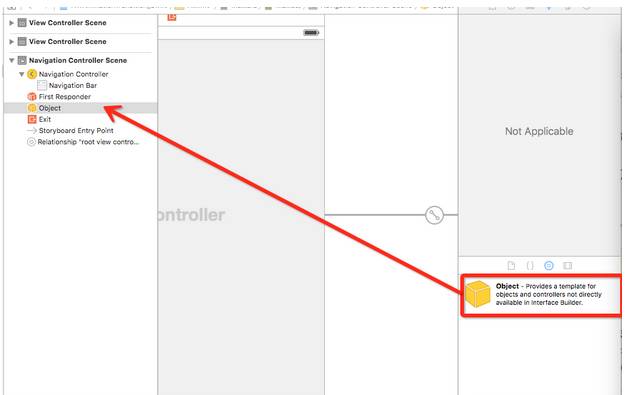 现在继续打开storyboard,然后在右下角搜索Object,并将其拖拽至左边Navigation Controller Source里,