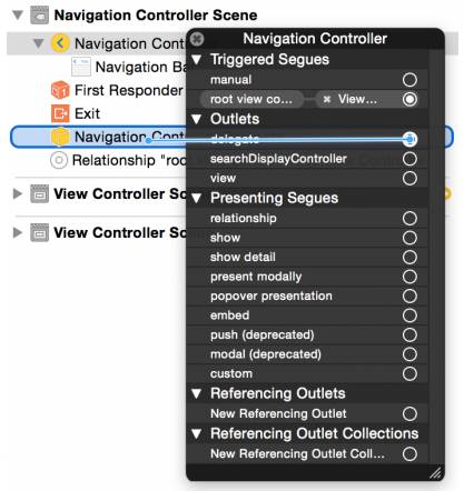 最后在左侧,点击UINavigationController,并将其delegate设置为刚才的Object