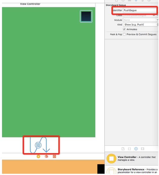 这时候两个VC之间就会出现一条线,然后点击线中间,设置identifier为PushSegue,这里设置一个标识符,为后面的跳转做准备,效果如下:
