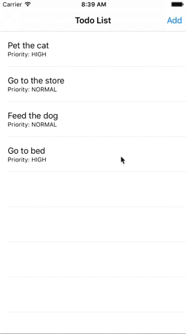 // TodoListViewController.swiftoverride func tableView(tableView: UITableView, editActionsForRowAtIndexPath indexPath: NSIndexPath) -> [UITableViewRowAction]? {let todoViewModel = viewModel.viewModelAtIndexPath(indexPath)let toggleCompleteAction = UITableViewRowAction(style: UITableViewRowActionStyle.Normal, title: todoViewModel.completeActionTitle) { [unowned self] (action, path) -> Voidinself.appContext.eventsObserver.sendNext(Event.RequestToggleCompleteTodoViewModel(todoViewModel))}// ...return[deleteAction, toggleCompleteAction]}
