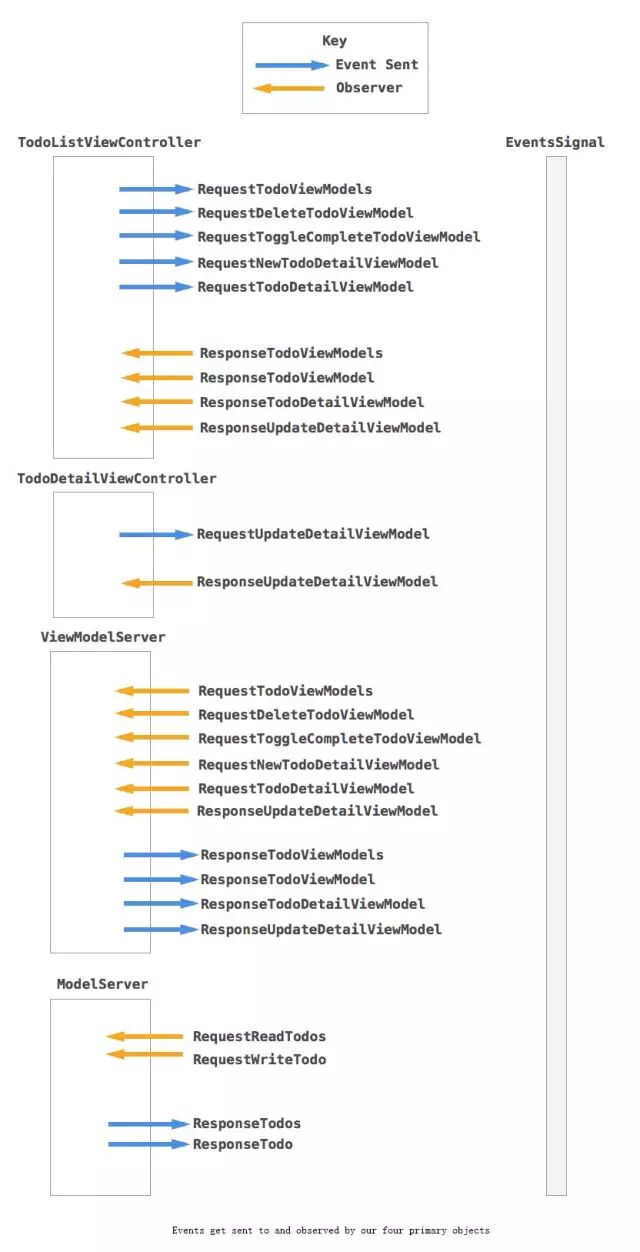 ViewModelServer将观察其本身将发送的消息,因为现在它必须立即创建一个更新待办事项Model并发送一个写待办事项的Event。它的响应会通过正常的Event流传回并由TodoListViewController透明地更新。