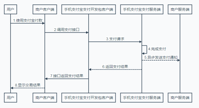 4.用户点击确认支付按钮,调用手机支付宝客户端(在你手机上装的那个),利用后台传过来的那个参数调起支付宝,让支付宝客户端传给他们服务器交互,进行付款。(这一步是支付宝自己完成的,安全性高)