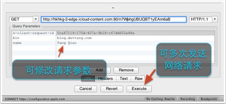 我们可以修改该请求的任何信息,包括 URL 地址、端口、参数等,之后点击 “Execute” 即可发送该修改后的网络请求(如下图所示)。Charles 支持我们多次修改和发送该请求,这对于我们和服务器端调试接口非常方便,如下图所示: