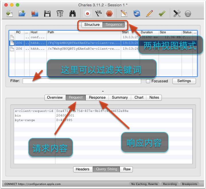 Charles 主要提供两种查看封包的视图,分别名为 “Structure” 和 “Sequence”。