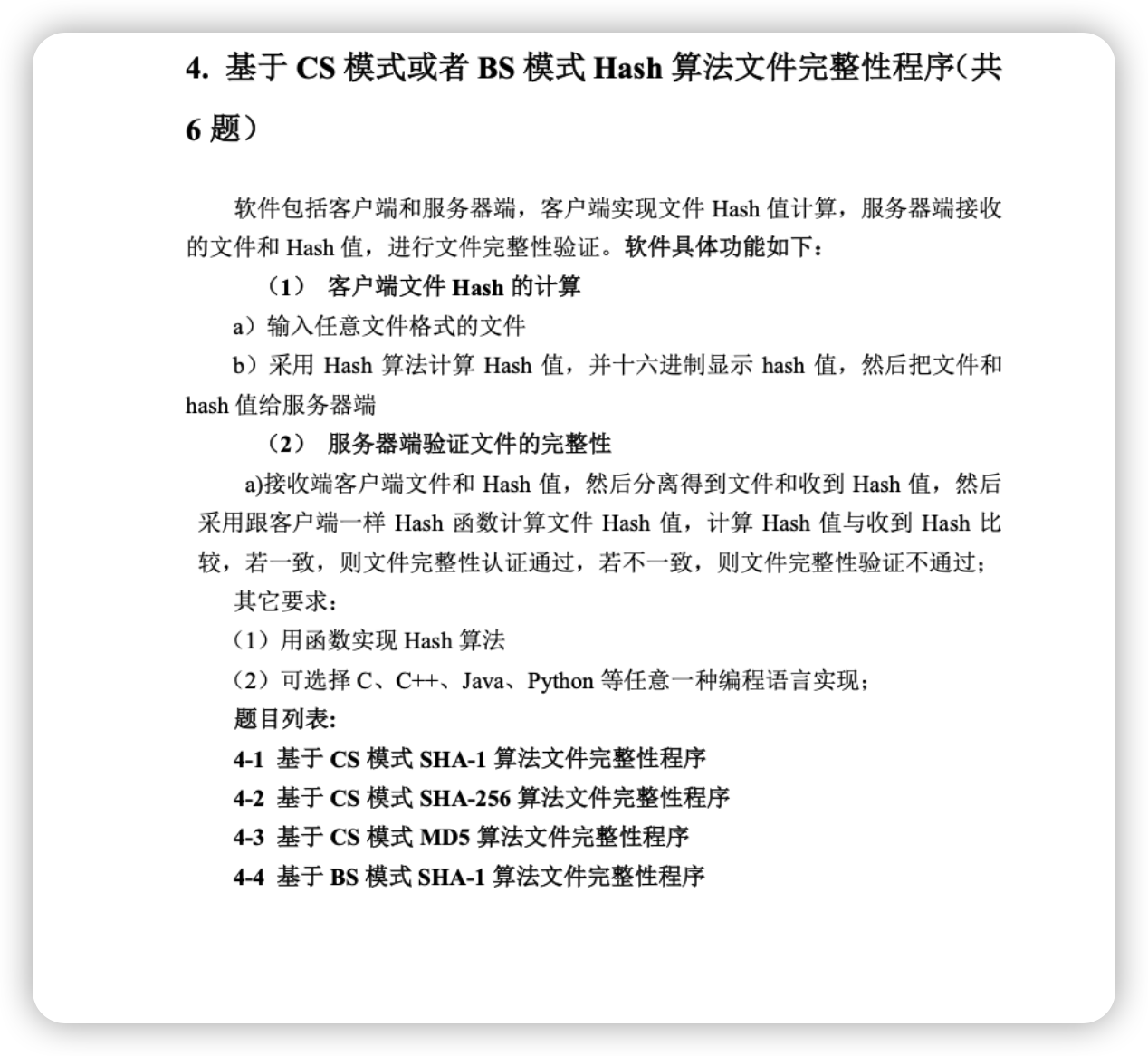 基于 CS 模式或者 BS 模式 Hash 算法 软件包括客户端和服务器端,客户端实现文件 Hash 值计算,服务器端接收 的文件和 Hash 值,进行文件完整性验证。软件具体功能如下: