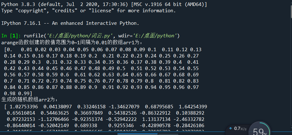 import numpy as np #1、创建一个数值范围为0~1,间隔为0.01的数组 arr1=np.arange(0,1,0.01) print("arange函数创建的数值范围为0~1间隔为0.01的数组arr1为:\n",arr1) #2、创建由100个服从正态分布的随机数构成的数组 arr2=np.random.randn(100) print('生成的随机数组arr2为:\n',arr2) #3、对创建的两个数组进行四则运算 print('arr1 + arr2:\n',arr1+arr2) print('arrl-arr2:\n',arr1-arr2) print('arrl*arr2:\n',arr1*arr2) print('arrl/arr2:\n',arr1/arr2) #print('arrl**arr2:\n',arr1**arr2) #4、对创建的数组进行简单的统计分析 print('正态分布数数组的累计和为:\n',np.cumsum(arr2))#计算所有元素的累计和 print('正态分布数去重后的值组为:\n',np.unique(arr2))#去除重复值 print('正态分布数组的均值为:',np.mean(arr2))#计算数组均值 print('正态分布数组的标准差为:',np.std(arr2))#计算数组标准差 print('正态分布数组的方差为:',np.var(arr2))#计算数组方差 print('正态分布数组的最小值为:',np.min(arr2))#计算最小值 print('正态分布数组的最大值为:',np.max(arr2))#计算最大值 print('正态分布数组的总和为:',np.sum(arr2))#计算数组总和