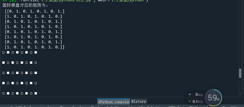 import numpy as np matr1=np.ones((8,8)) for i in range(8): for j in range(8): if(i+j)%2==0: matr1[i,j]=0 print('国际棋盘对应的矩阵为:\n',matr1) for i in range(0,8): for j in range(0,8): if matr1[i,j]==0: print("□",end=' ') else: print("■", end=' ') print('\n')