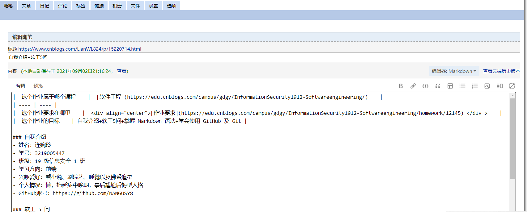 | 这个作业的目标 | 自我介绍+软工5问+掌握 Markdown 语法+学会使用 GitHub 及 Git |