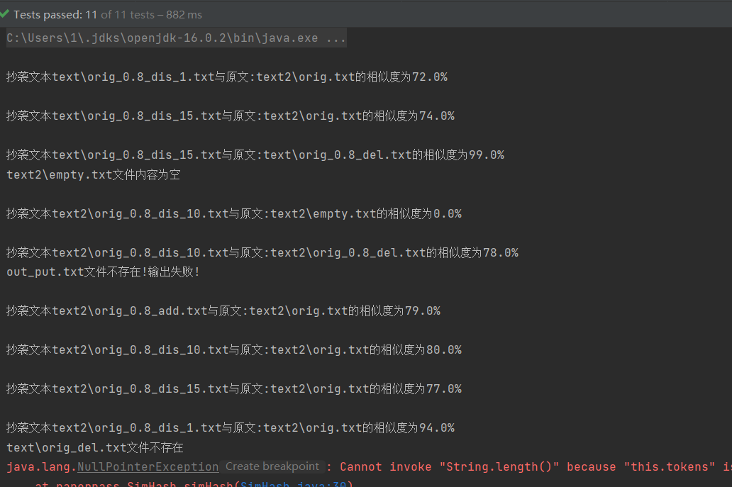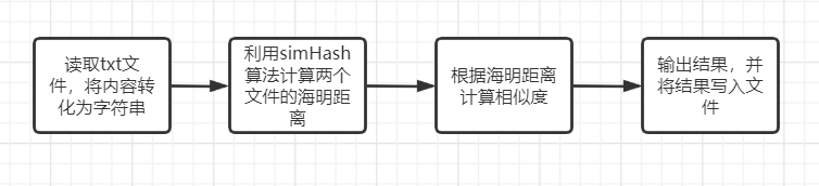- simHash(): 程序的关键函数,将文本进行分词,并得到一个 simHash 值。