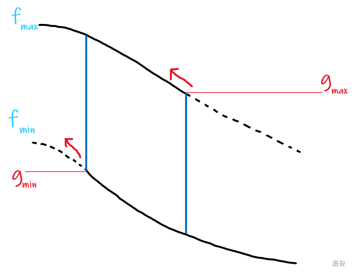 由于 \(gmax\) 和 \(gmin\) 都是单调不降的,所以需要维护这两个点。