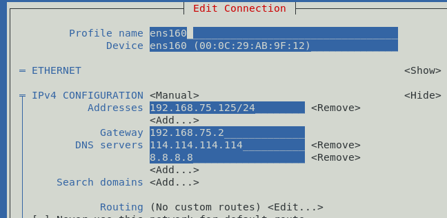 [root@rhel8 ~]# nmcli connection add con-name ens160 type ethernet ifname ens160 ipv4.addresses 192.168.75.125/24 ipv4.dns 192.168.75.2 ipv4.gateway 192.168.75.2 ipv4.method manual