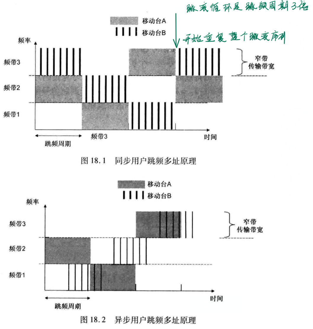 - 跳频可以作为一种多址方式来应用,并且获得类似时分多址和频分多址的频谱效率。