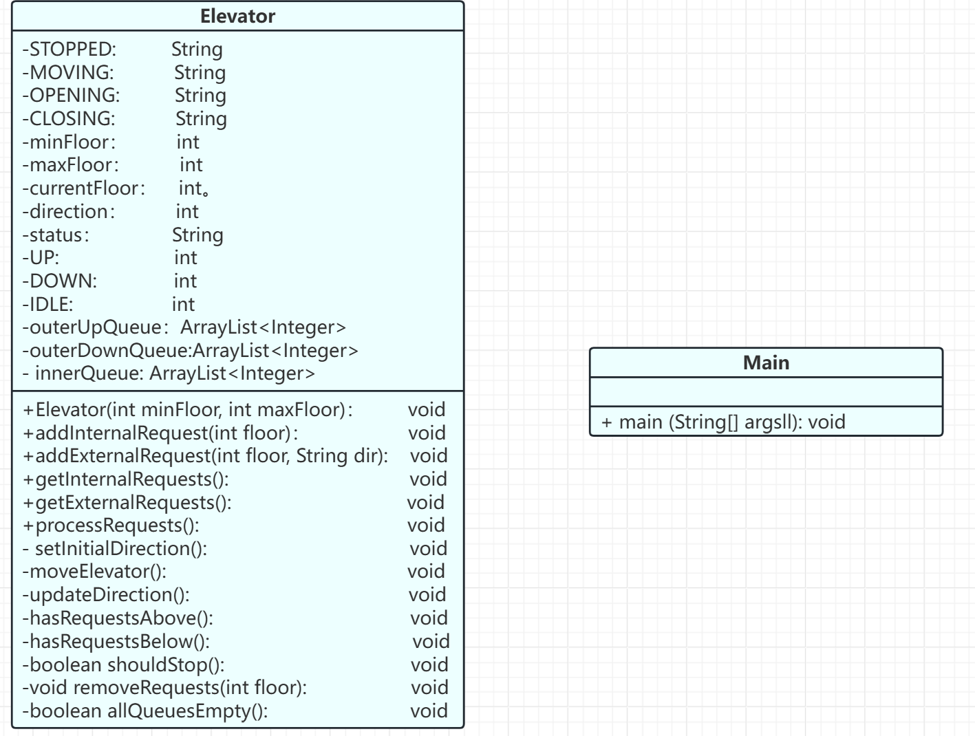设计一个电梯类,具体包含电梯的最大楼层数、最小楼层数(默认为1层)当前楼层、运行方向、运行状态,以及电梯内部乘客的请求队列和电梯外部楼层乘客的请求队列,其中,电梯外部请求队列需要区分上行和下行。