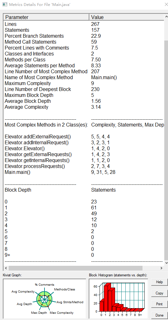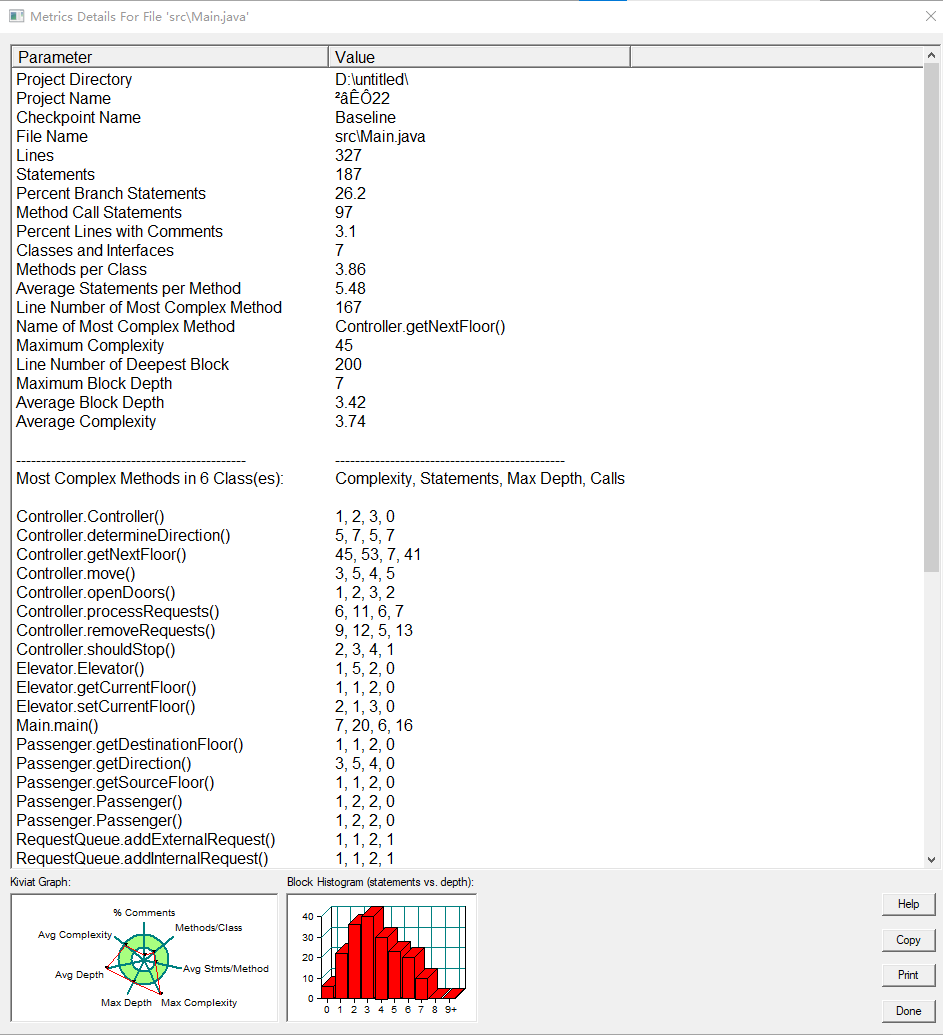 第三次类图中相较于第二次类图进行了将队列里由第二题的具体数据类型改为了存储乘客类对象数据,各个方法中对乘客类数据的请求进行操作,代码数也是写了327行,在类的设计时又第二次题目的传入内部队列为数据换成了队列存储的都是乘客对象,模拟现实逻辑,但报表中可以看出因为时间问题这次写的代码用了很多的ifelse的分支语句使得代码复杂度大大上升甚至到了45,所以代码是有着很高的可以简化提升的地方。
