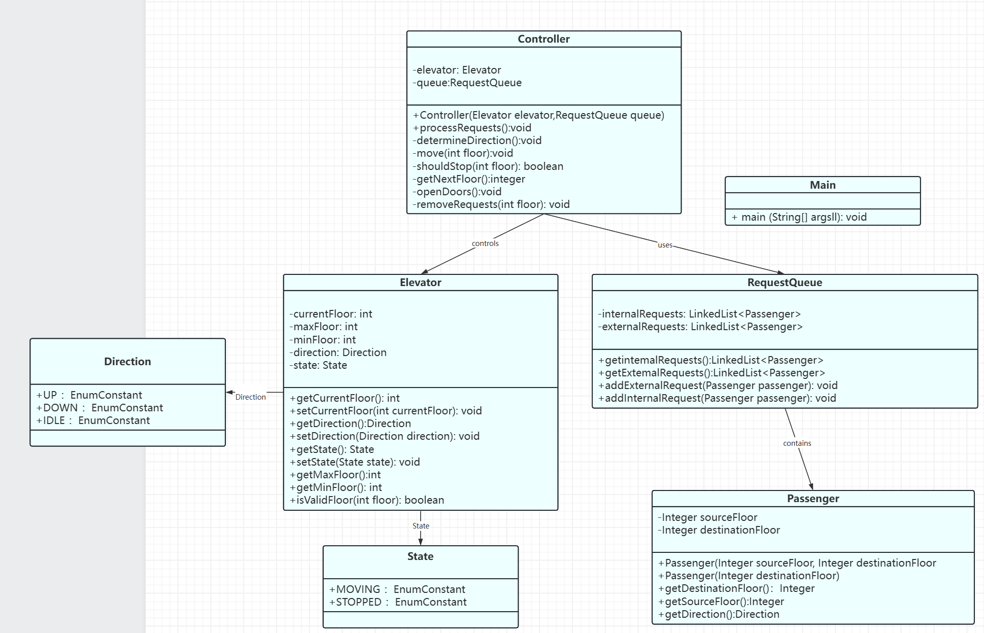 请编写一个Java程序,设计一个电梯类,包含状态管理、请求队列管理以及调度算法,并使用一些测试用例,模拟不同的请求顺序,观察电梯的行为是否符合预期,比如是否优先处理同方向的请求,是否在移动过程中处理顺路的请求等。为了降低编程难度,不考虑同时有多个乘客请求同时发生的情况,即采用串行处理乘客的请求方式(电梯只按照规则响应请求队列中当前的乘客请求,响应结束后再响应下一个请求),具体运行规则详见输入输出样例。