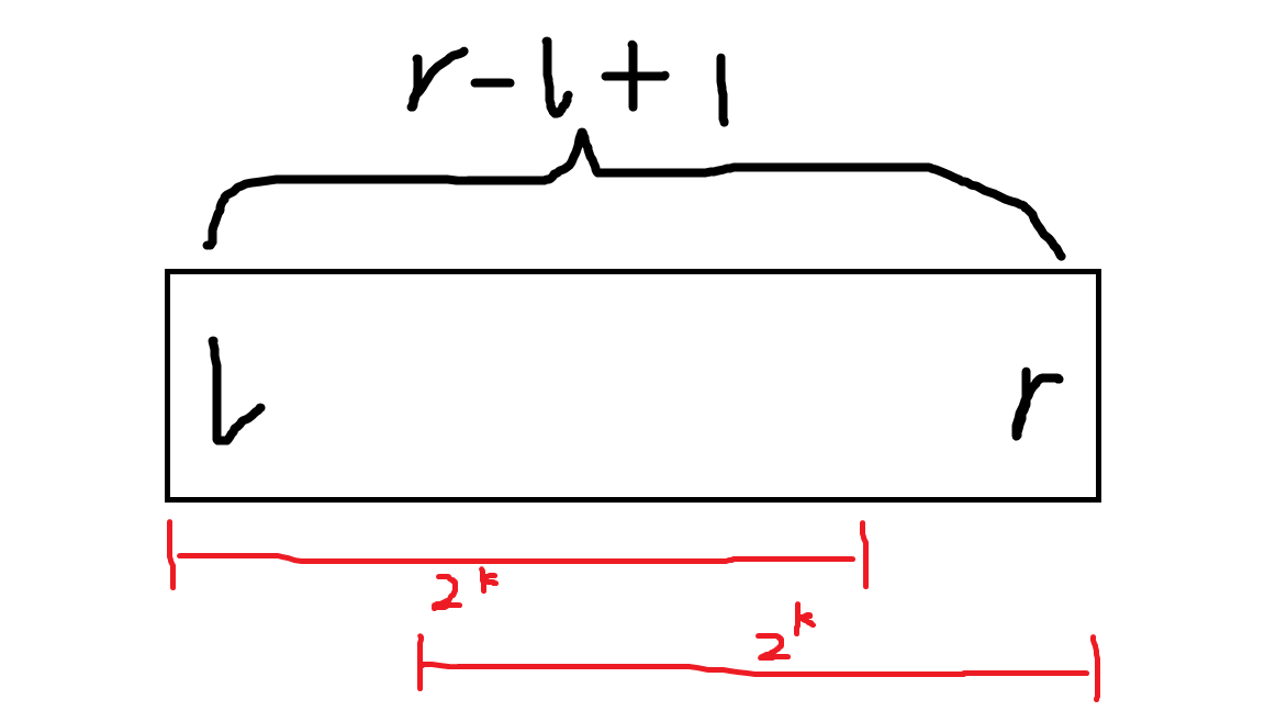 假定 2k 为不大于 r - l +1 的最大的 2 的幂,那么当取如图所示的两个宽度同为 2k 的区间刚好可以覆盖住整个要求的区间,因为要求的是最值,所以有重叠的部分其实并不会影响整个区间的最值,因此我们可以从这两个区间的最值中取出我们要的最值。