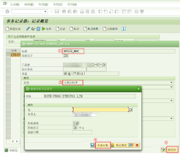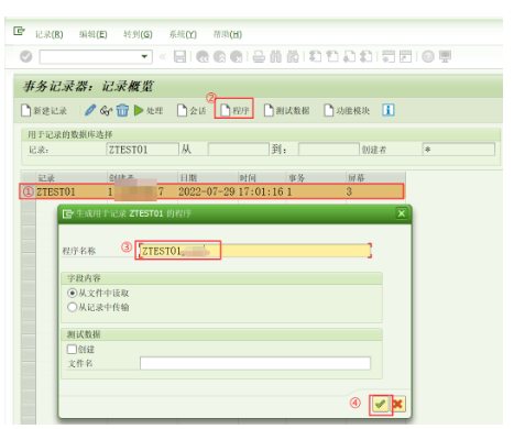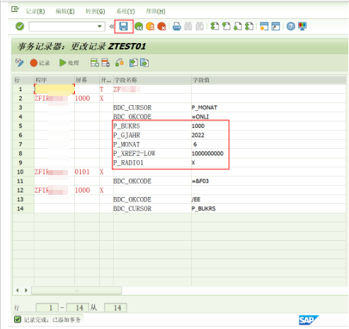录制结束之后,点击保存 P_BUKRS、P_GJAHR、P_MONAT、P_XREF2-LOW、P_RADI01是录制时,屏幕输入的数据