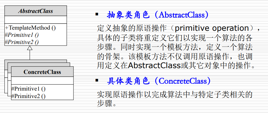 定义一个操作中的算法的骨架,而将一些步骤延迟到子类中。