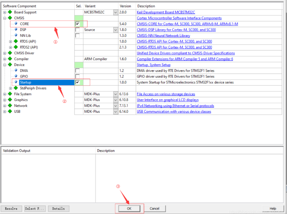 运行环境配置,主要是CMSIS下选择CORE;Device下Startup,其中包含了启动文件
