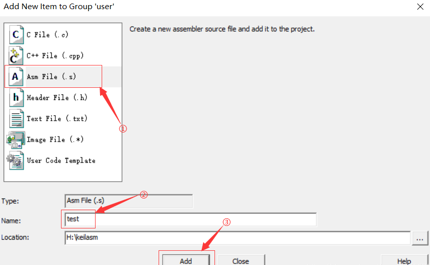 2.选择 Asm File (.s) ,设置源文件的名称,点击Add(.s后缀的为汇编文件)