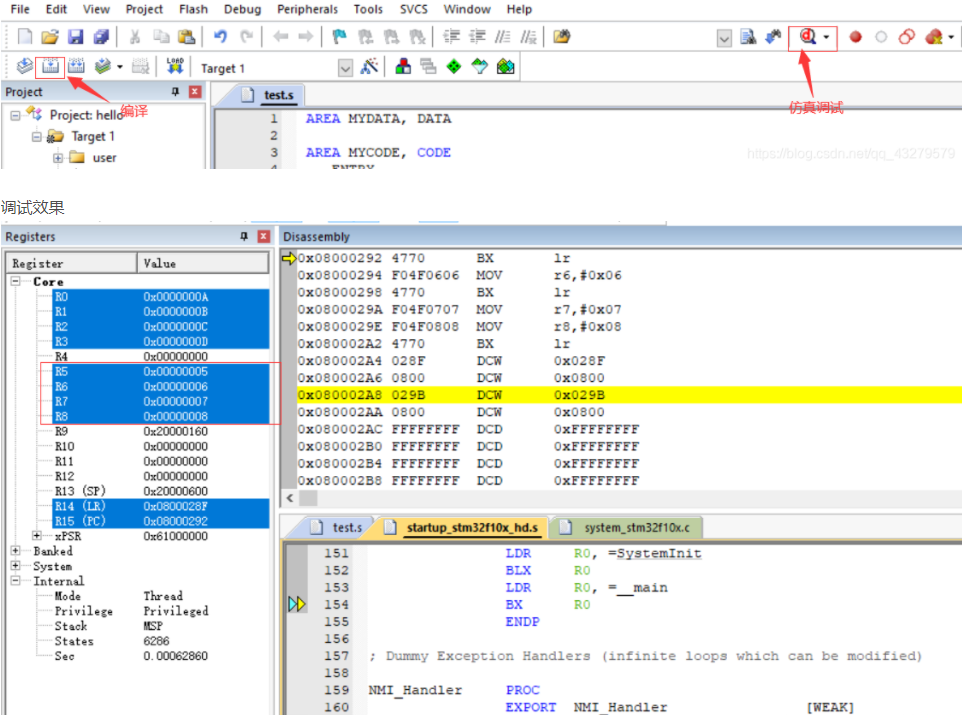 AREA MYDATA, DATA AREA MYCODE, CODE ENTRY EXPORT __main __main MOV R0, #10 MOV R1, #11 MOV R2, #12 MOV R3, #13 ;LDR R0, =func01 BL func01 ;LDR R1, =func02 BL func02 BL func03 LDR LR, =func01 LDR PC, =func03 B . func01 MOV R5, #05 BX LR func02 MOV R6, #06 BX LR func03 MOV R7, #07 MOV R8, #08 BX LR