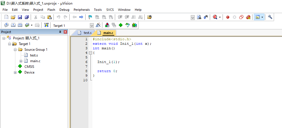 在C语言中调用汇编函数时,需要在.c文件中用extern Return_Type Function_Name(Datatype parameter); 声明,然后在main函数中调用,在汇编里面用EXPORT Function_Name就可以与.c文件中的函数联系起来。