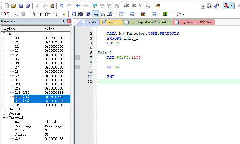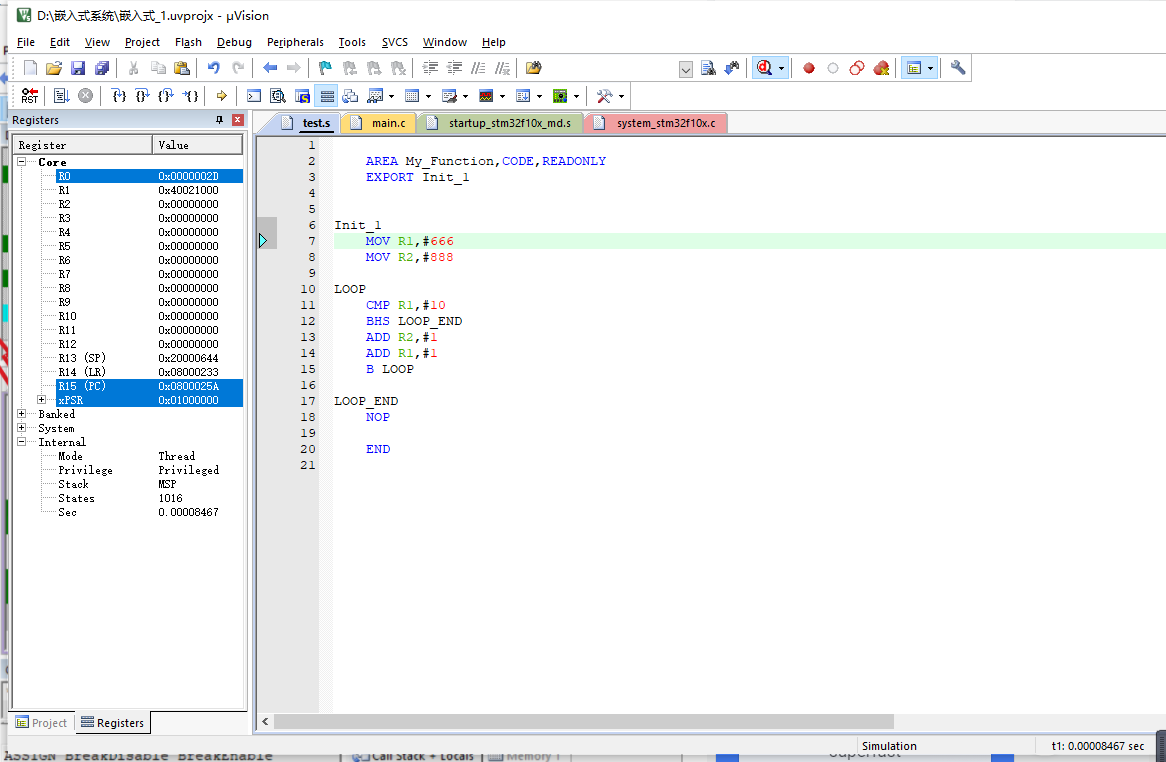 AREA My_Function,CODE,READONLY EXPORT Init_1 Init_1 MOV R1,#666 MOV R2,#888 LOOP CMP R1,#10 BHS LOOP_END ADD R2,#1 ADD R1,#1 B LOOP LOOP_END NOP END