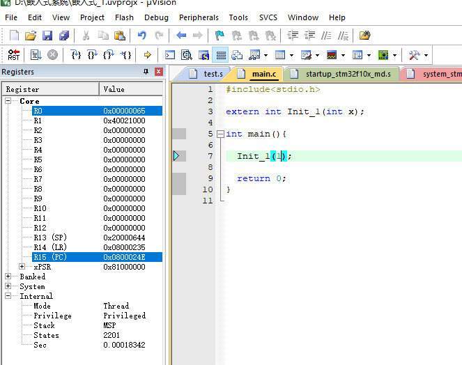 在该实验中,我们的Init_1函数调用时有一个参数的传递,在main函数中我们调用Init_1函数,给了一个参数1,函数执行完毕时,1+100的16进制数为65,我们对函数执行完毕的期望值为65,而在图中寄存器R0的值就是65。