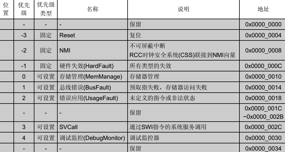 上图-3到6这个区域被标黑了,这个区域就是内核异常。内核异常不能够被打断,不能被设置优先级(也就是说优先级是凌驾于外部中断之上的)。常见的内核异常有以下几种:复位(reset),不可屏蔽中断(NMI),硬错误(Hardfault),其他的也可以在表上找到。