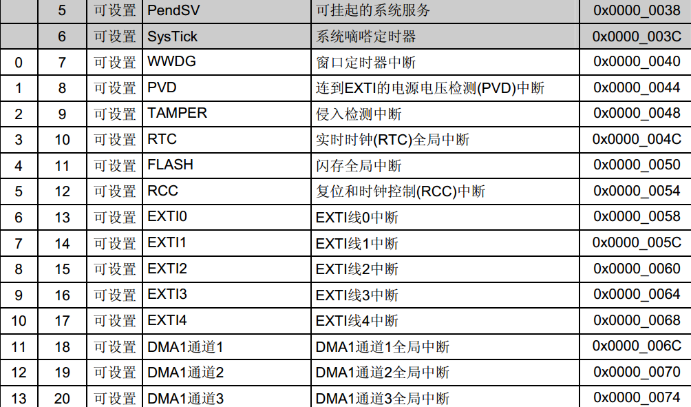 STM32具有十分强大的中断系统,将中断分为了两个类型:内核异常和外部中断。并将所有中断通过一个表编排起来,下面是stm32中断向量表的部分内容: