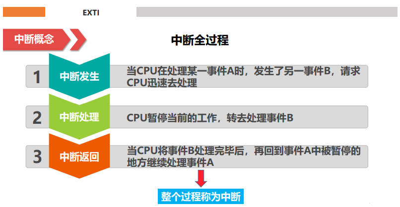中断,在单片机中占有非常重要的地位,几乎任何一款单片机都会有中断。。代码默认地从上向下执行,遇到条件或者其他语句,会按照指定的地方跳转。而在单片机执行代码的过程中,难免会有一些突发的情况需要处理,这样就会打断当前的代码,待处理完突发情况之后,程序会回到被打断的地方继续执行。