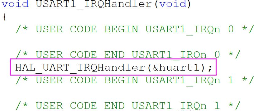 void HAL_UART_IRQHandler(UART_HandleTypeDef *huart) { //删除了前面代码 /* If no error occurs */ errorflags = (isrflags & (uint32_t)(USART_ISR_PE | USART_ISR_FE | USART_ISR_ORE | USART_ISR_NE)); if (errorflags == 0U) { /* UART in mode Receiver ---------------------------------------------------*/ if (((isrflags & USART_ISR_RXNE_RXFNE) != 0U) && (((cr1its & USART_CR1_RXNEIE_RXFNEIE) != 0U) || ((cr3its & USART_CR3_RXFTIE) != 0U))) { if (huart->RxISR != NULL) { huart->RxISR(huart); } return; } } //删除了后面代码 }