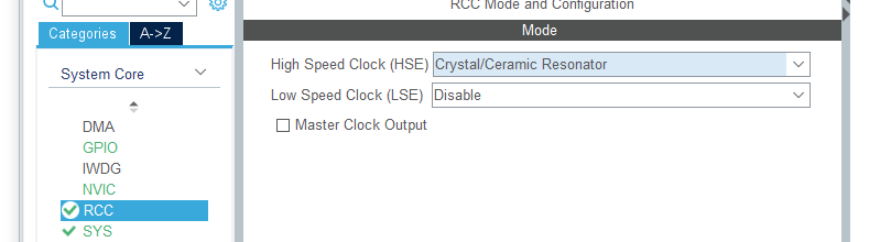 然后在Rcc里的High Speed Clock 中选择Crystal/Ceramic Resonator