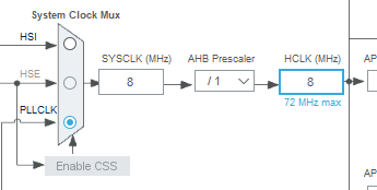 选择PLLCLK,然后将后面的晶振频率最大值改为72M赫兹