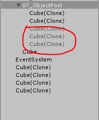 3.把创建的cube赋给monster对象,鼠标左键创建,右键销毁。可见右键销毁时并没有真正把物体销毁掉,而只是隐藏了起来,等到下一次左键创建新物体时再把隐藏的物体现实出来,这样就达到了节约内存的效果。只有当隐藏的对象全部都显示完毕但仍然在进行创建操作时,才会真正实例化一个物体。