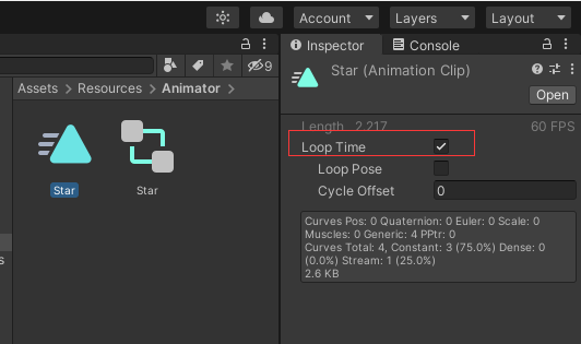 3.新建animator文件夹,里面创建关于星星的动画和动画控制器,动画勾选looptime,让它循环播放,然后点击即开始。