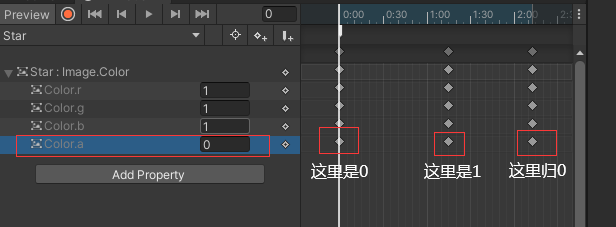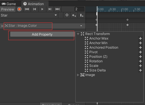 5.设置animation。 这里期待效果是触发场景时效果图有一个闪烁,可以理解为图片的透明度从1→0→1,我们可以选择Star预制体,在animation面板内选增加属性,因为我们要修改的只有图片透明度,所以选Image-Color属性添加进去就可以了。
