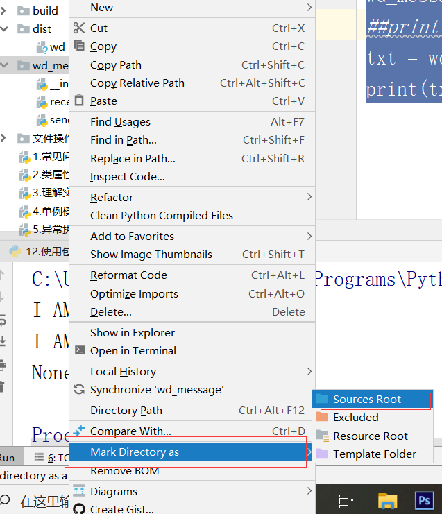 然后在当前目录下创建一个使用包的测试程序,这时候导入包会发现有报错,我们需要把需要导入的目录设置为码源