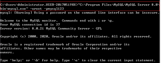 在命令行窗口中拖入mysql.exe 再以格式-u用户名 -p密码加到尾部 登录成功后如图所示。