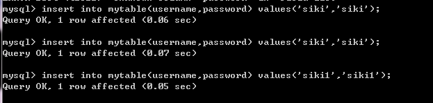 插入语句:insert into 表名(属性1, 属性2) values(插入的属性1, 插入的属性2);这里插入了三行。