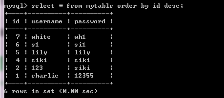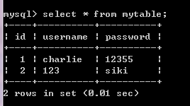 下图命令create table mytable(id int auto_increment, username varchar(30), password varchar(30), primary key(id));