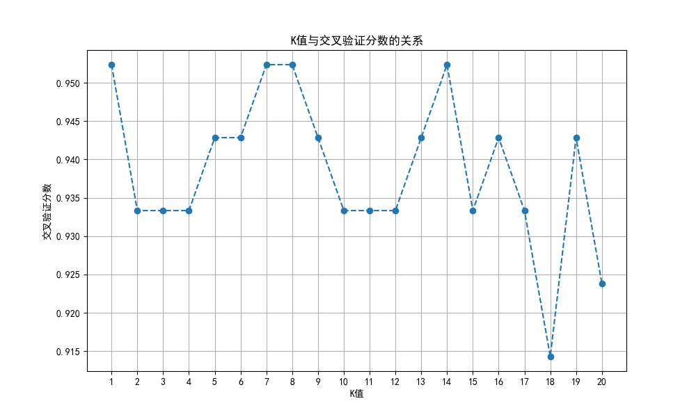 在这个图中,X轴代表K值,Y轴代表交叉验证分数。