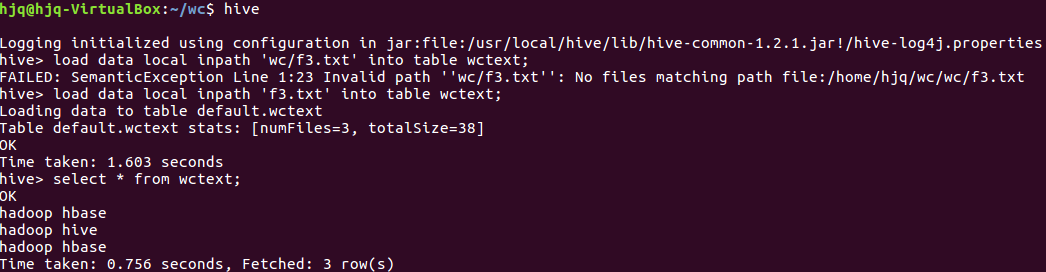 3.4导入文件的数据到文本表中 load data local inpath