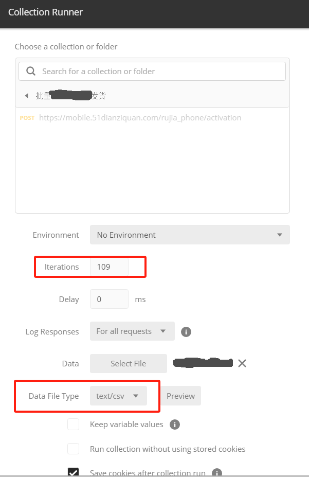 2.保存到一个collection中 3.run collection 4.选择参数文件,参数格式用逗号分割