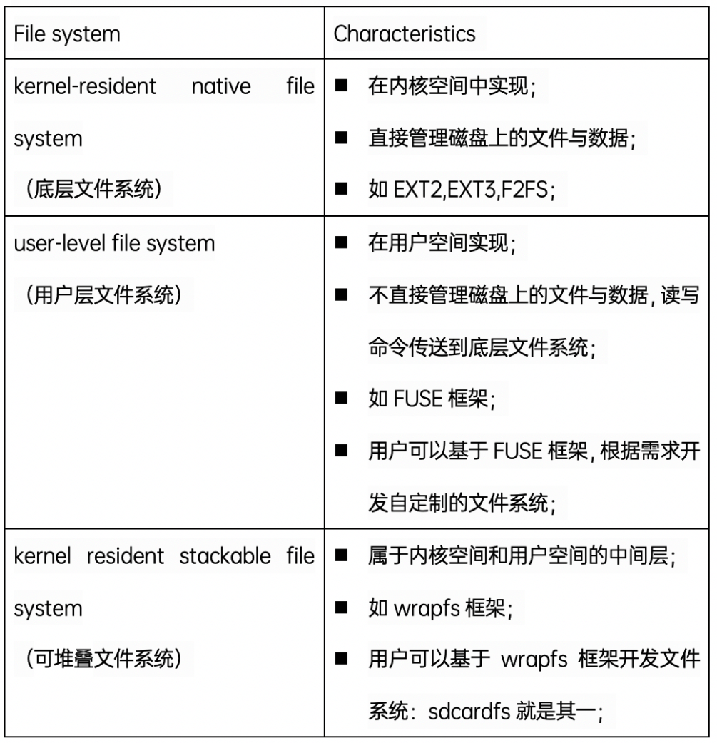 sdcardfs是基于wrapfs开发的。wrapfs是什么、又是如何在FUSE,EXT的文件系统大家族中拥有一席之地呢?我们借助wrapfs的开发者Erez对文件系统的分类来分析一下: