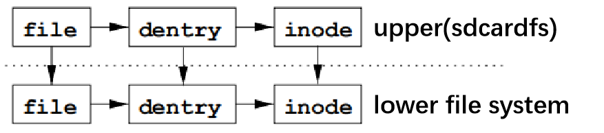 在底层文件系统中,我们需要inode、dentry、file多个struct来定位某个文件或数据的所在位置。那么多了一层sdcardfs之后,如何保证IO性能呢?sdcardfs文件系统内也构建对应的inode、dentry、file结构体,并和底层文件系统的inode、dentry、file结构体链接起来,如图所示: