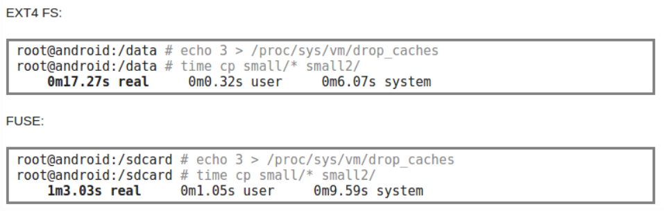 Double caching:在FUSE框架中的每一次读写调用,数据都会从内核内存复制到用户层缓存,原本的page cache因为FUSE的存在,又大了一倍。而sdcardfs只作为操作和参数的传递者而非处理者,所以从架构中避免了重复缓存的问题。