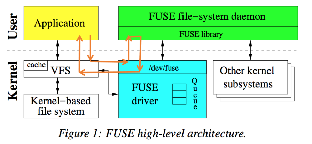 当操作挂载FUSE的路径时,用户的命令会随着图中的橘色剪头所示,经过如下一段旅程:1)当用户产生操作命令时,会通过glibc的系统调用将命令传递到内核层的VFS;2)VFS根据所在分区的文件系统将命令传递给对应文件系统的接口,这里挂载的文件系统当然是FUSE;3)FUSE内核模块收到命令后,会将命令分类放在某个队列中等待处理(包括pending,background,processing,interrupts,forgets五个队列,这里不展开讨论队列策略,感兴趣可参考文献1的3.1.1章节[1])/dev/fuse块设备会通过既定的通信协议将操作请求发送给上层FUSE守护进程来“处理”请求,而如何处理操作请求,取决于开发者在守护进程中的具体实现,这就是用户态文件系统开发者需要开发的部分。4)FUSE的守护进程将操作处理完后,将处理结果返回块设备/dev/fuse;5)FUSE内核模块将处理结果返回给VFS,VFS再将结果原路返回给上层。