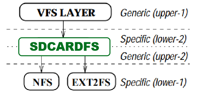 如图所示,sdcardfs仍然处于内核空间。它不同于FUSE,不是内核态和用户态的中间层,而是处于VFS与底层文件系统的中间。在没有sdcardfs的时候,虚拟文件系统层将操作命令直接向下传给指定的文件系统,比如EXT4或F2FS;加上sdcardfs之后,操作命令会经过VFS->sdcardfs->底层文件系统。流程简洁明了无需多言,问题的关键在于,sdcardfs如何将操作命令中的数据快速准确地转发给底层文件系统,并且不会因为sdcardfs自身的存在而影响原来的操作性能。